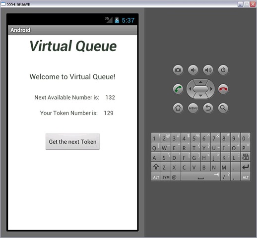 Below the two title labels are widgets that display the next available token number and the number of the token that the user of this application is currently holding, respectively, These are composed of two LinearLayouts, arranged one below the other and each layout containing two text labels. One being the static text telling the user what the number next to it means and the second label a dynamic string that will be updated based on a user action (the user action could be from the holder of the device, when s/he pushes the button to request the server to dispense a token, or it could be in reaction to some other user of another such device or the web site requesting for a token in which case our Android will display the updated number for the next available token).