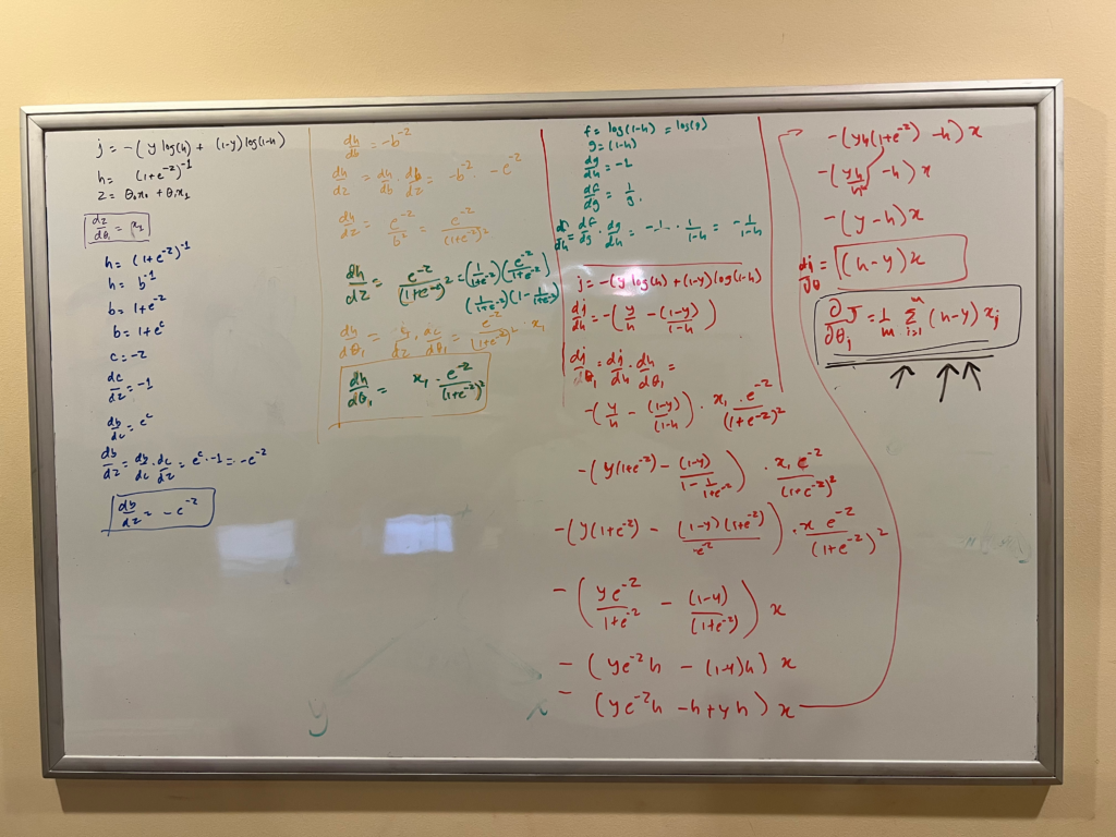 I tell my kids that math can only be learned by putting the pen on the paper, and here, I proved it again by doing the math on the whiteboard. I have a much better understanding of how backpropagation works in Neural Networks and how they arrive at the best-fitting parameters for a model.